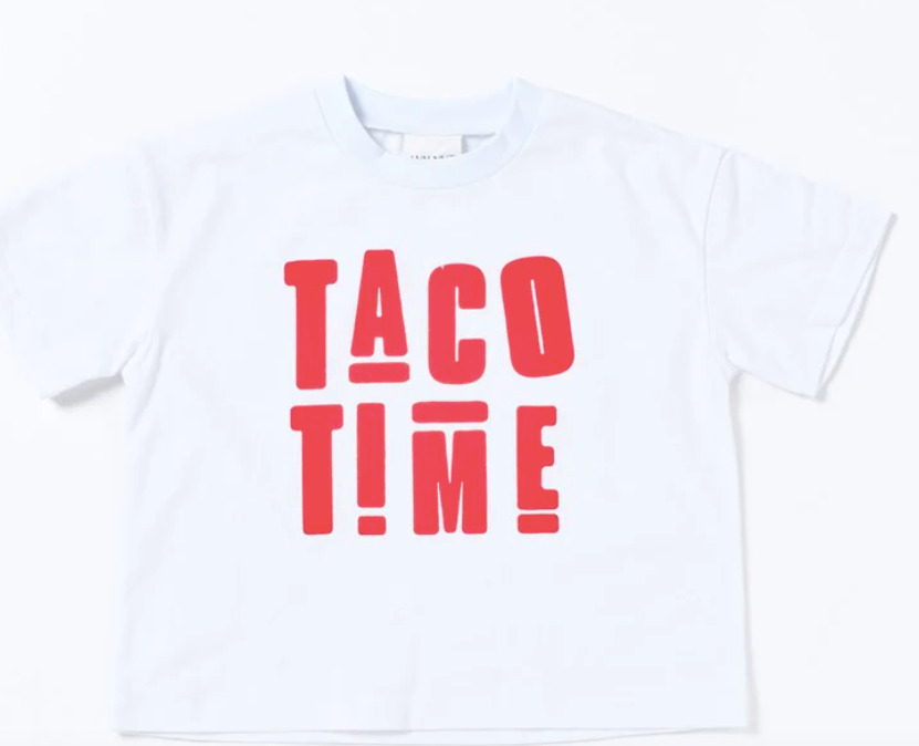 It’s always taco time in this fun and bold tee! Made from super soft, breathable cotton. this white t-shirt features a playful red “TACO TIME” graphic in chunky block lettering that’s full of personality—just like your little one.