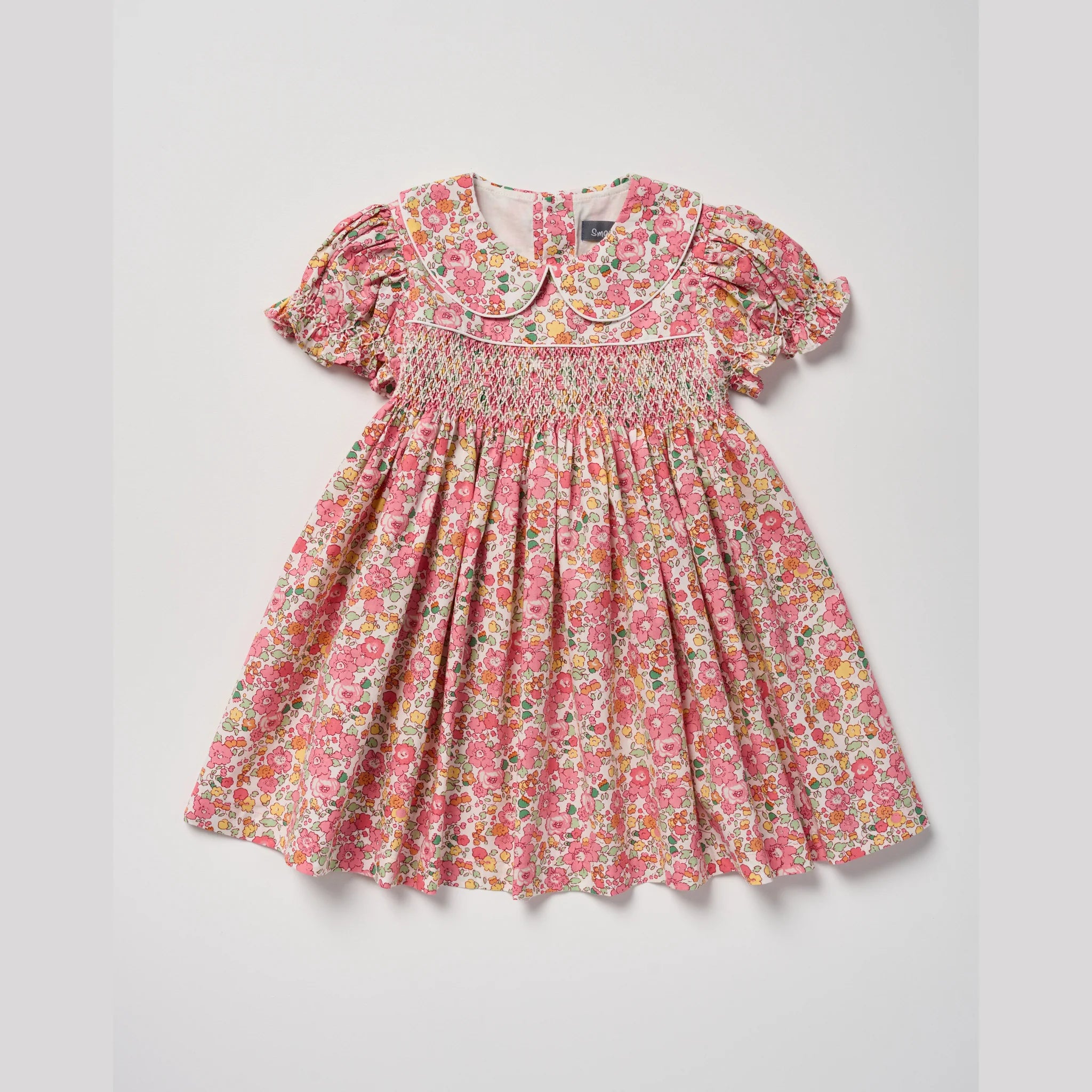 Smox Rox Classic with fabricPeter Pan collar edged in white. Classic white hand smocking with pink stitches.Loose puff fabric sleeve with white piping across front and back. Fabric sash edged in white.