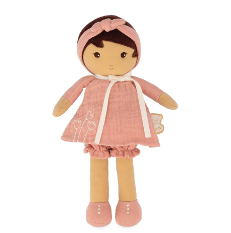 Tendresse Amandine is pretty as a picture and the perfect doll for comfort and friendship. She has a soft terracotta dress and headband with flower embellishments stitched on the skirt and matching shoes with embroidered buttons. Removable coordinating bloomers allow you to change Amandine during play time, so she is ready for nap time. A long ribbon is attached to her back so that you can write your name and never lose her! Presented in a gorgeous window box and made from easy care, machine washable fabrics, Tendresse Amandine is 25cm tall and makes an ideal gift for any occasion. Amandine's dress and bloomers are made from organic cotton and she is filled with stuffing made from 100% recycled plastic bottles making her eco-friendly too!