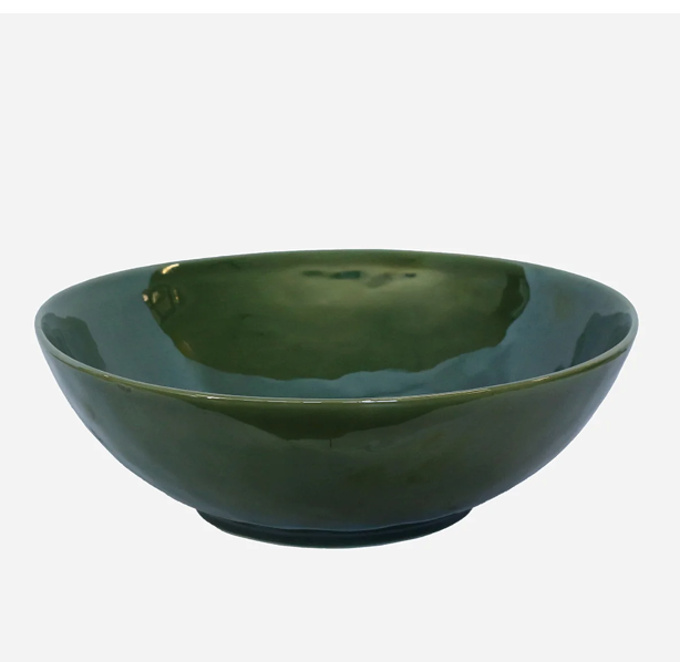 This organic round bowl in a soft dark green tone creates an eclectic look in a kitchen or on a tablescape. Each piece features a variation in colour and texture.