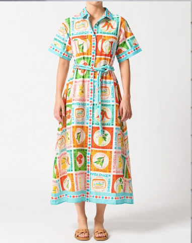A vacation-ready statement piece, the Cannes Dress in Ciao Sicily is a playful ode to la dolce vita. Featuring an all-over nostalgic Italian print with vibrant motifs and sun-soaked colors, this button-up midi dress is both bold and breezy. The short sleeves and collared neckline bring a relaxed polish, while the removable waist tie lets you cinch it in or wear it loose.