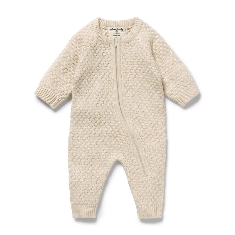 Made from a beautiful blend of organic cotton, bamboo and wool, this luxurious long sleeve knit growsuit from Wilson and Frenchy features an all over jacquard design and zip through opening for quick and easy nappy changes. Perfect for play dates and outdoor adventures, pair it with a knitted hat or blanket for a gorgeous baby shower gift every parent will love.